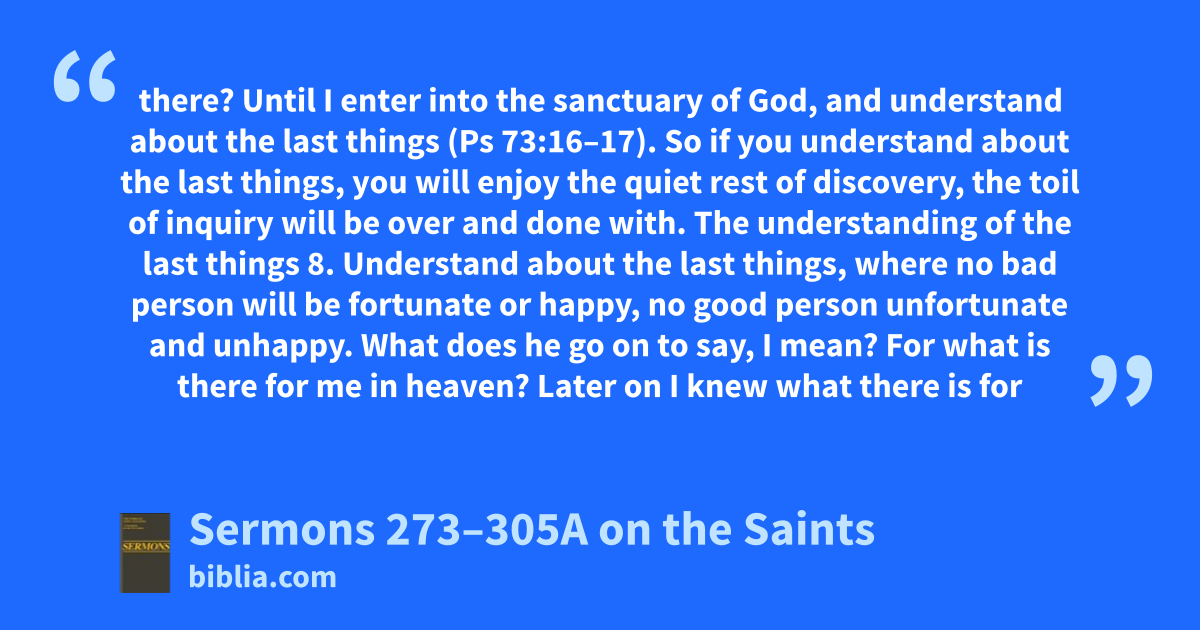 there? Until I enter into the sanctuary of God, and understand about the last things (Ps 73:16–17). So if you understand about the last things, you will enjoy the quiet rest of discovery, the toil of inquiry will be over and done with. The understanding of the last things 8. Understand about the last things, where no bad person will be fortunate or happy, no good person unfortunate and unhappy. What does he go on to say, I mean? For what is there for me in heaven? Later on I knew what there is for