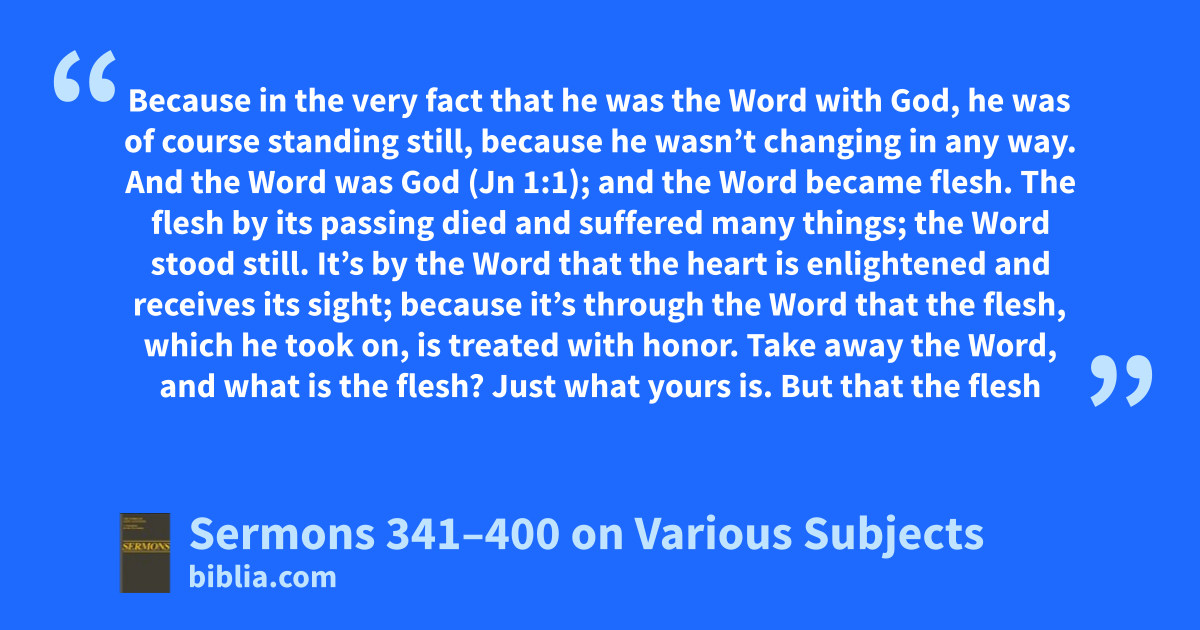 Because in the very fact that he was the Word with God, he was of course standing still, because he wasn’t changing in any way. And the Word was God (Jn 1:1); and the Word became flesh. The flesh by its passing died and suffered many things; the Word stood still. It’s by the Word that the heart is enlightened and receives its sight; because it’s through the Word that the flesh, which he took on, is treated with honor. Take away the Word, and what is the flesh? Just what yours is. But that the flesh