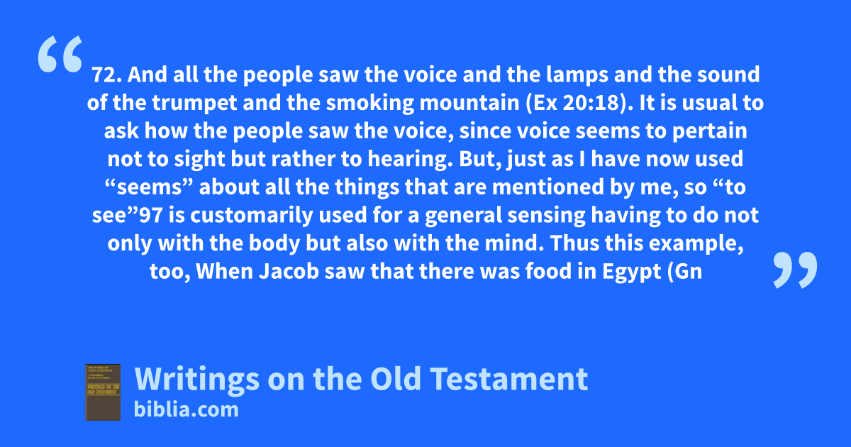 72. And all the people saw the voice and the lamps and the sound of the trumpet and the smoking mountain (Ex 20:18). It is usual to ask how the people saw the voice, since voice seems to pertain not to sight but rather to hearing. But, just as I have now used “seems” about all the things that are mentioned by me, so “to see”97 is customarily used for a general sensing having to do not only with the body but also with the mind. Thus this example, too, When Jacob saw that there was food in Egypt (Gn