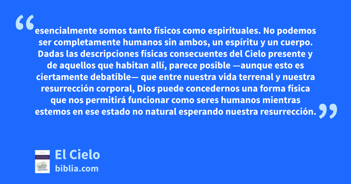 esencialmente somos tanto físicos como espirituales. No podemos ser completamente humanos sin ambos, un espíritu y un cuerpo. Dadas las descripciones físicas consecuentes del Cielo presente y de aquellos que habitan allí, parece posible —aunque esto es ciertamente debatible— que entre nuestra vida terrenal y nuestra resurrección corporal, Dios puede concedernos una forma física que nos permitirá funcionar como seres humanos mientras estemos en ese estado no natural esperando nuestra resurrección.