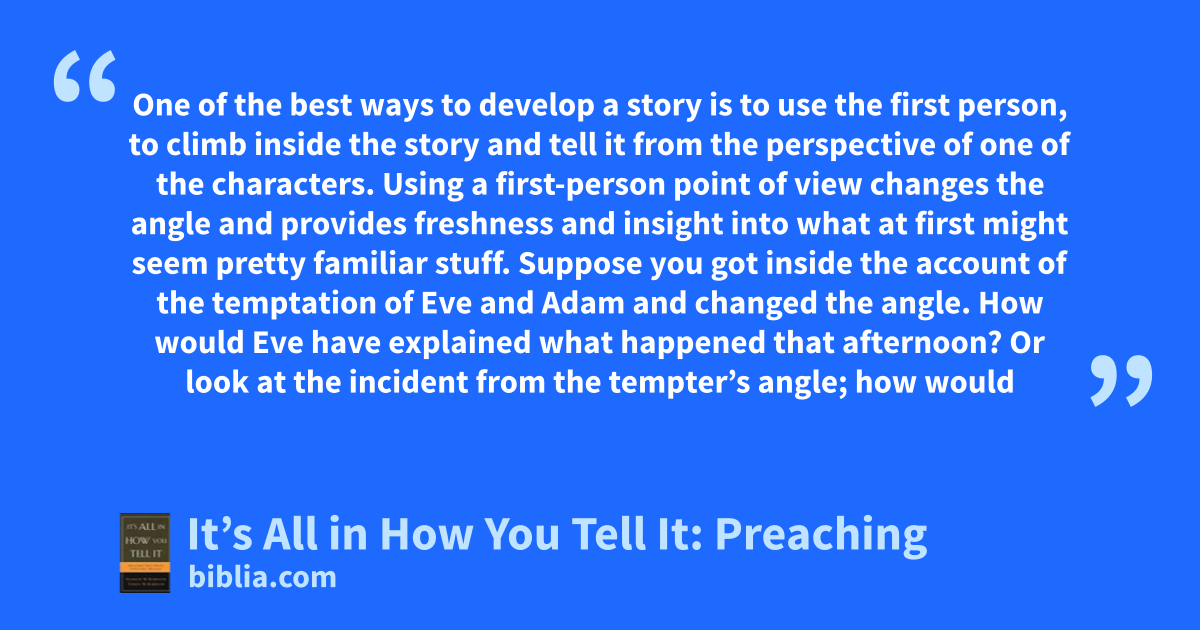 One of the best ways to develop a story is to use the first person, to climb inside the story and tell it from the perspective of one of the characters. Using a first-person point of view changes the angle and provides freshness and insight into what at first might seem pretty familiar stuff. Suppose you got inside the account of the temptation of Eve and Adam and changed the angle. How would Eve have explained what happened that afternoon? Or look at the incident from the tempter’s angle; how would