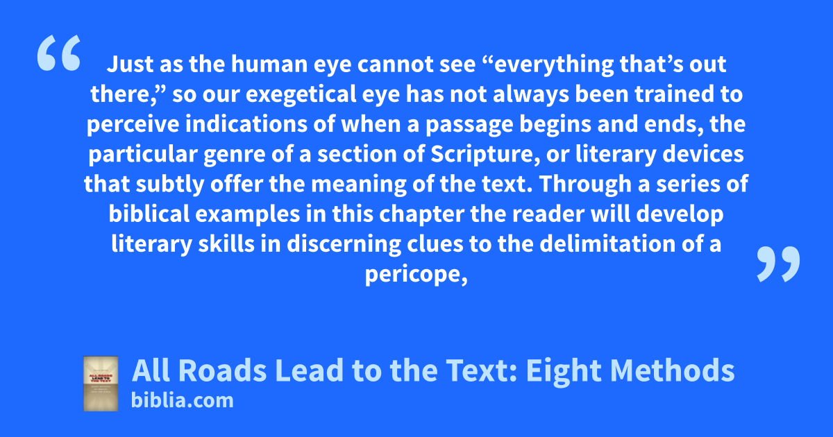 Just as the human eye cannot see “everything that’s out there,” so our exegetical eye has not always been trained to perceive indications of when a passage begins and ends, the particular genre of a section of Scripture, or literary devices that subtly offer the meaning of the text. Through a series of biblical examples in this chapter the reader will develop literary skills in discerning clues to the delimitation of a pericope,