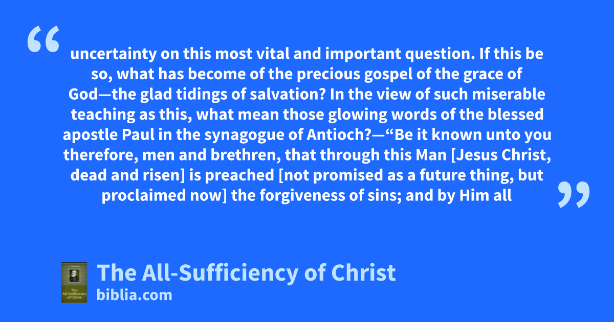 uncertainty on this most vital and important question. If this be so, what has become of the precious gospel of the grace of God—the glad tidings of salvation? In the view of such miserable teaching as this, what mean those glowing words of the blessed apostle Paul in the synagogue of Antioch?—“Be it known unto you therefore, men and brethren, that through this Man [Jesus Christ, dead and risen] is preached [not promised as a future thing, but proclaimed now] the forgiveness of sins; and by Him all