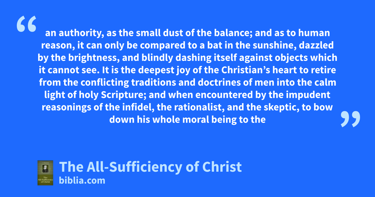 an authority, as the small dust of the balance; and as to human reason, it can only be compared to a bat in the sunshine, dazzled by the brightness, and blindly dashing itself against objects which it cannot see. It is the deepest joy of the Christian’s heart to retire from the conflicting traditions and doctrines of men into the calm light of holy Scripture; and when encountered by the impudent reasonings of the infidel, the rationalist, and the skeptic, to bow down his whole moral being to the