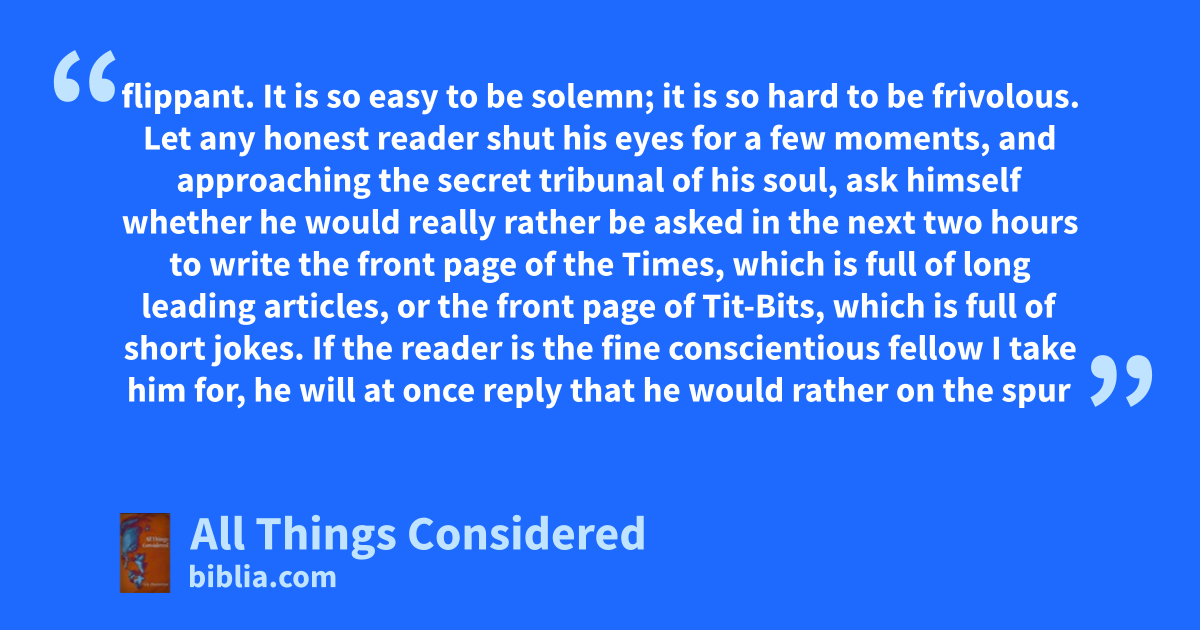 flippant. It is so easy to be solemn; it is so hard to be frivolous. Let any honest reader shut his eyes for a few moments, and approaching the secret tribunal of his soul, ask himself whether he would really rather be asked in the next two hours to write the front page of the Times, which is full of long leading articles, or the front page of Tit-Bits, which is full of short jokes. If the reader is the fine conscientious fellow I take him for, he will at once reply that he would rather on the spur