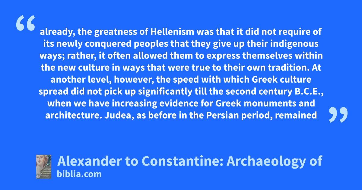 already, the greatness of Hellenism was that it did not require of its newly conquered peoples that they give up their indigenous ways; rather, it often allowed them to express themselves within the new culture in ways that were true to their own tradition. At another level, however, the speed with which Greek culture spread did not pick up significantly till the second century B.C.E., when we have increasing evidence for Greek monuments and architecture. Judea, as before in the Persian period, remained