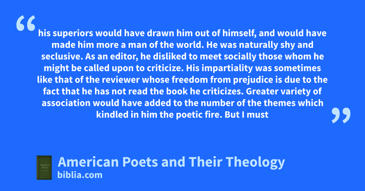 In American Poets and Their Theology, Strong examines the lives and work of nine American poets. He provides close readings of their poems, analyzing them through an evangelical lens. Strong examines the work of William Cullen Bryant, Ralph Waldo Emerson, John Greenleaf Whittier, Edgar Allan Poe, Henry Wadsworth Longfellow, James Russell Lowell, Oliver Wendell Holmes, Sidney Lanier, and Walt...