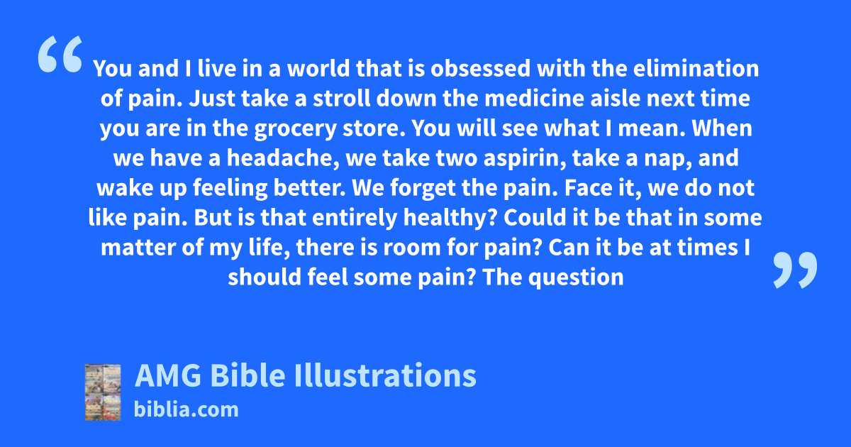 You and I live in a world that is obsessed with the elimination of pain. Just take a stroll down the medicine aisle next time you are in the grocery store. You will see what I mean. When we have a headache, we take two aspirin, take a nap, and wake up feeling better. We forget the pain. Face it, we do not like pain. But is that entirely healthy? Could it be that in some matter of my life, there is room for pain? Can it be at times I should feel some pain? The question