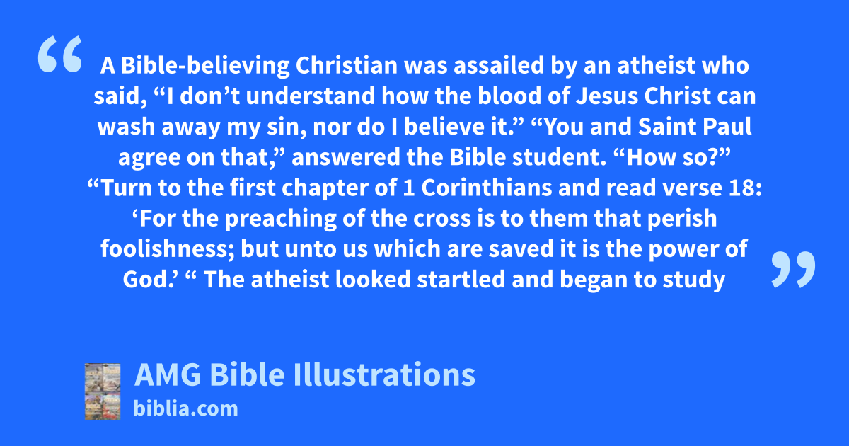 A Bible-believing Christian was assailed by an atheist who said, “I don’t understand how the blood of Jesus Christ can wash away my sin, nor do I believe it.” “You and Saint Paul agree on that,” answered the Bible student. “How so?” “Turn to the first chapter of 1 Corinthians and read verse 18: ‘For the preaching of the cross is to them that perish foolishness; but unto us which are saved it is the power of God.’ “ The atheist looked startled and began to study