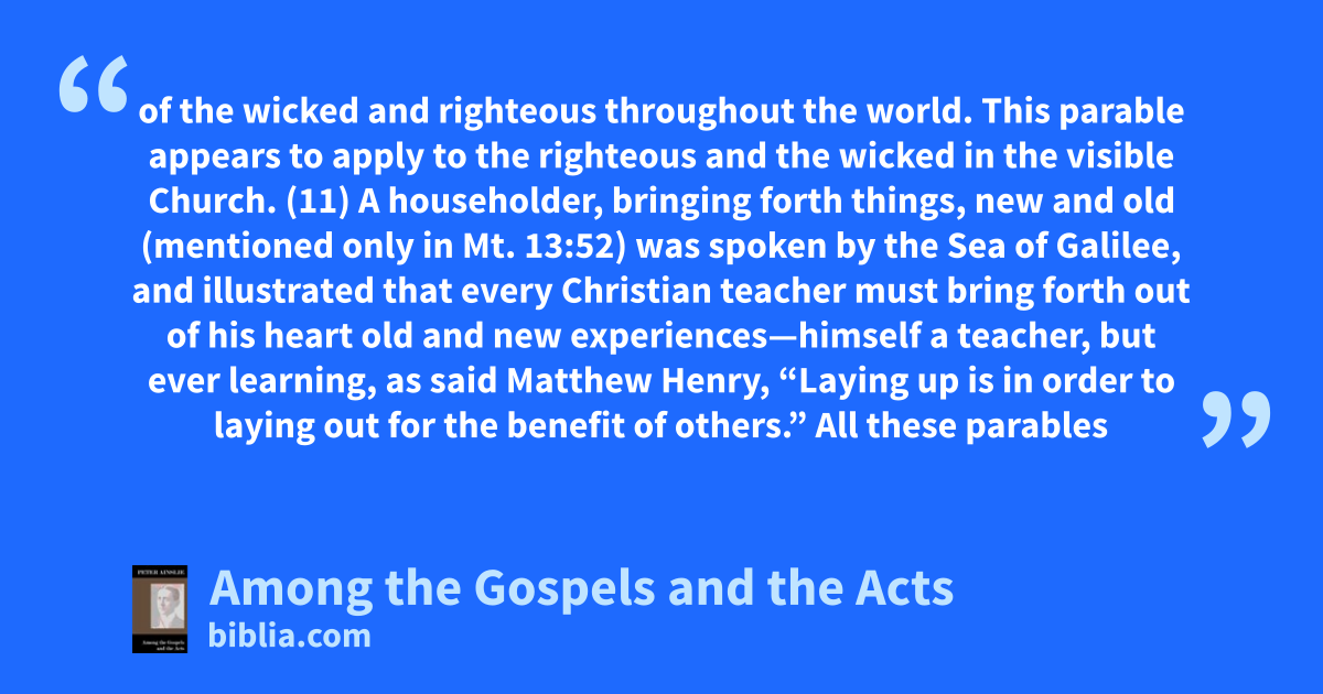 of the wicked and righteous throughout the world. This parable appears to apply to the righteous and the wicked in the visible Church. (11) A householder, bringing forth things, new and old (mentioned only in Mt. 13:52) was spoken by the Sea of Galilee, and illustrated that every Christian teacher must bring forth out of his heart old and new experiences—himself a teacher, but ever learning, as said Matthew Henry, “Laying up is in order to laying out for the benefit of others.” All these parables