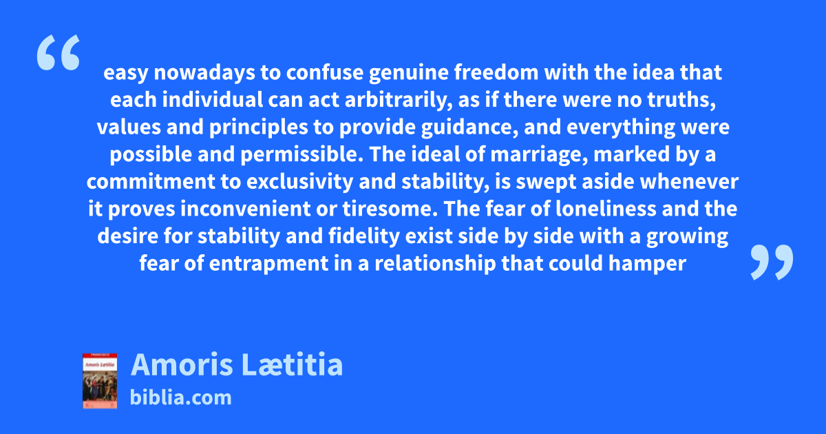 easy nowadays to confuse genuine freedom with the idea that each individual can act arbitrarily, as if there were no truths, values and principles to provide guidance, and everything were possible and permissible. The ideal of marriage, marked by a commitment to exclusivity and stability, is swept aside whenever it proves inconvenient or tiresome. The fear of loneliness and the desire for stability and fidelity exist side by side with a growing fear of entrapment in a relationship that could hamper