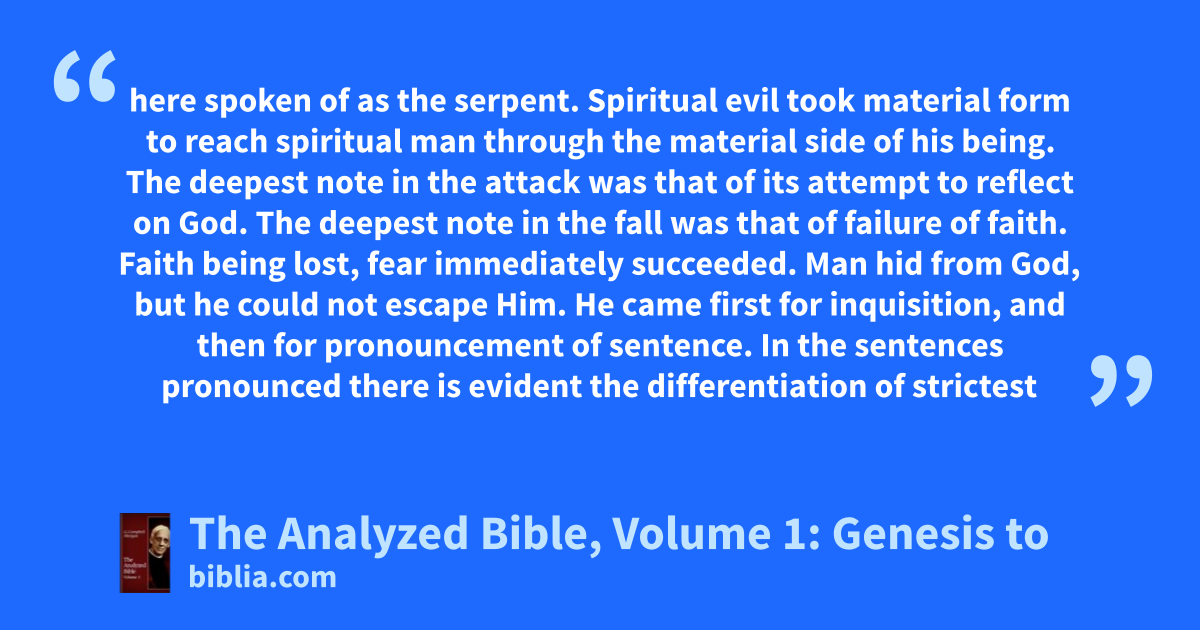 here spoken of as the serpent. Spiritual evil took material form to reach spiritual man through the material side of his being. The deepest note in the attack was that of its attempt to reflect on God. The deepest note in the fall was that of failure of faith. Faith being lost, fear immediately succeeded. Man hid from God, but he could not escape Him. He came first for inquisition, and then for pronouncement of sentence. In the sentences pronounced there is evident the differentiation of strictest