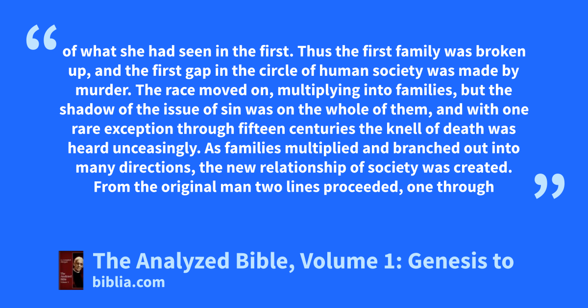 of what she had seen in the first. Thus the first family was broken up, and the first gap in the circle of human society was made by murder. The race moved on, multiplying into families, but the shadow of the issue of sin was on the whole of them, and with one rare exception through fifteen centuries the knell of death was heard unceasingly. As families multiplied and branched out into many directions, the new relationship of society was created. From the original man two lines proceeded, one through