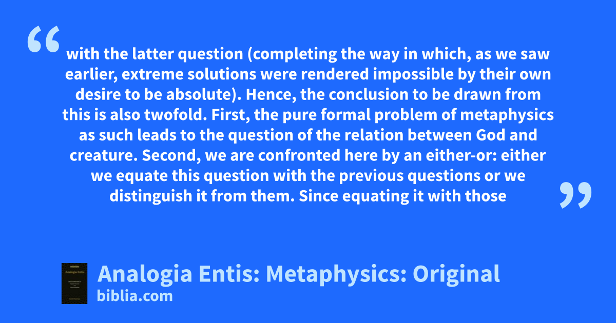 with the latter question (completing the way in which, as we saw earlier, extreme solutions were rendered impossible by their own desire to be absolute). Hence, the conclusion to be drawn from this is also twofold. First, the pure formal problem of metaphysics as such leads to the question of the relation between God and creature. Second, we are confronted here by an either-or: either we equate this question with the previous questions or we distinguish it from them. Since equating it with those
