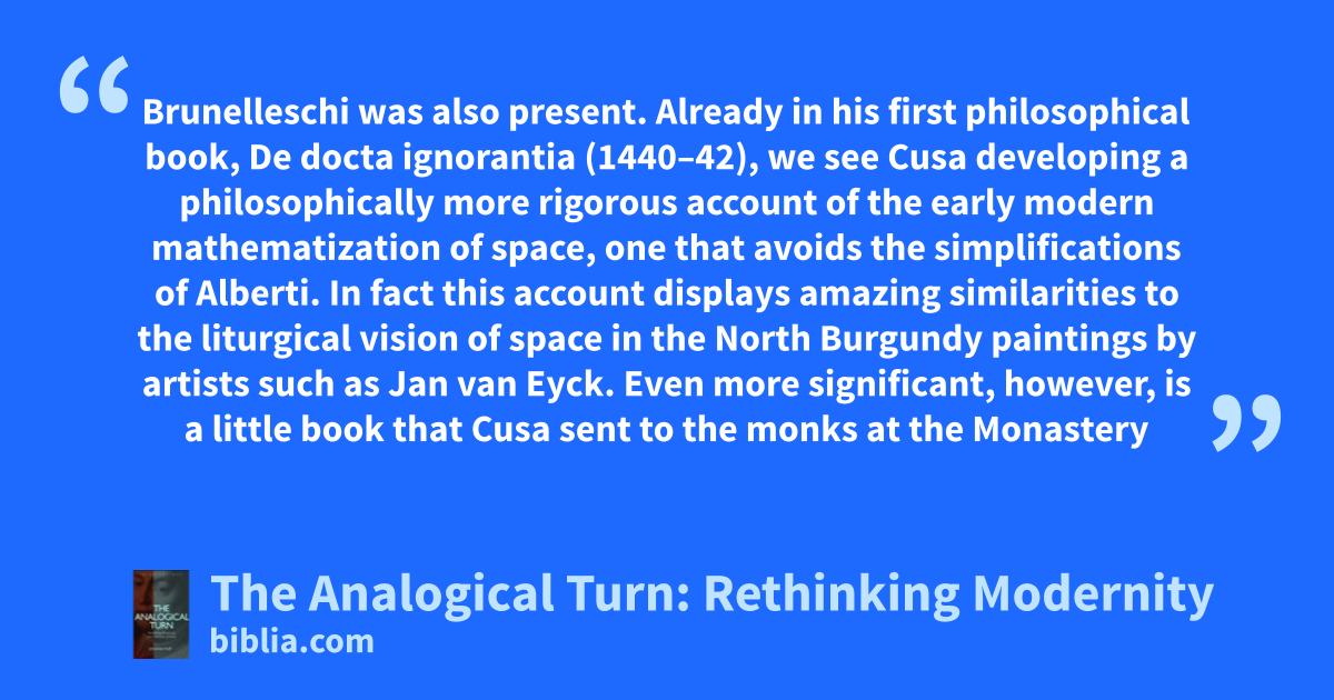 Brunelleschi was also present. Already in his first philosophical book, De docta ignorantia (1440–42), we see Cusa developing a philosophically more rigorous account of the early modern mathematization of space, one that avoids the simplifications of Alberti. In fact this account displays amazing similarities to the liturgical vision of space in the North Burgundy paintings by artists such as Jan van Eyck. Even more significant, however, is a little book that Cusa sent to the monks at the Monastery