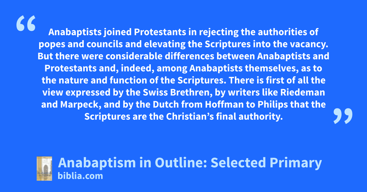 Anabaptists joined Protestants in rejecting the authorities of popes and councils and elevating the Scriptures into the vacancy. But there were considerable differences between Anabaptists and Protestants and, indeed, among Anabaptists themselves, as to the nature and function of the Scriptures. There is first of all the view expressed by the Swiss Brethren, by writers like Riedeman and Marpeck, and by the Dutch from Hoffman to Philips that the Scriptures are the Christian’s final authority.