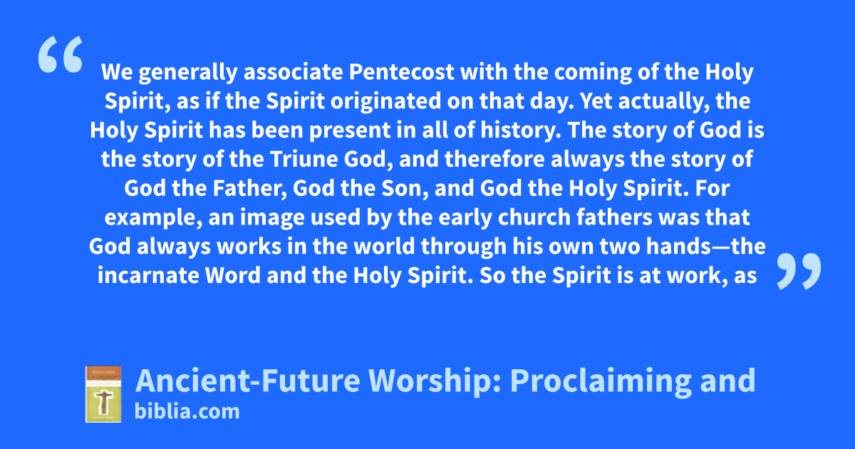 We generally associate Pentecost with the coming of the Holy Spirit, as if the Spirit originated on that day. Yet actually, the Holy Spirit has been present in all of history. The story of God is the story of the Triune God, and therefore always the story of God the Father, God the Son, and God the Holy Spirit. For example, an image used by the early church fathers was that God always works in the world through his own two hands—the incarnate Word and the Holy Spirit. So the Spirit is at work, as