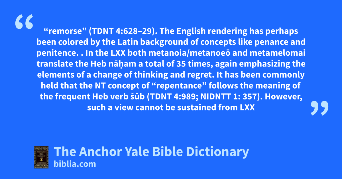 “remorse” (TDNT 4:628–29). The English rendering has perhaps been colored by the Latin background of concepts like penance and penitence. . In the LXX both metanoia/metanoeō and metamelomai translate the Heb nāḥam a total of 35 times, again emphasizing the elements of a change of thinking and regret. It has been commonly held that the NT concept of “repentance” follows the meaning of the frequent Heb verb šûb (TDNT 4:989; NIDNTT 1: 357). However, such a view cannot be sustained from LXX