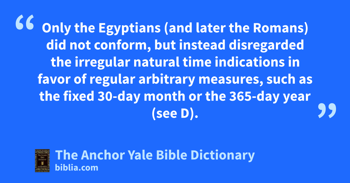 Only the Egyptians (and later the Romans) did not conform, but instead disregarded the irregular natural time indications in favor of regular arbitrary measures, such as the fixed 30-day month or the 365-day year (see D).