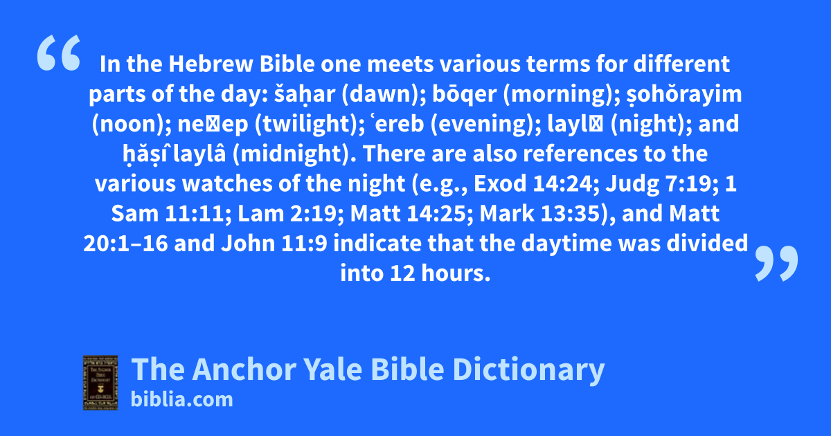 In the Hebrew Bible one meets various terms for different parts of the day: šaḥar (dawn); bōqer (morning); ṣohŏrayim (noon); nešep (twilight); ʿereb (evening); layl̯ (night); and ḥăṣı̂ laylâ (midnight). There are also references to the various watches of the night (e.g., Exod 14:24; Judg 7:19; 1 Sam 11:11; Lam 2:19; Matt 14:25; Mark 13:35), and Matt 20:1–16 and John 11:9 indicate that the daytime was divided into 12 hours.