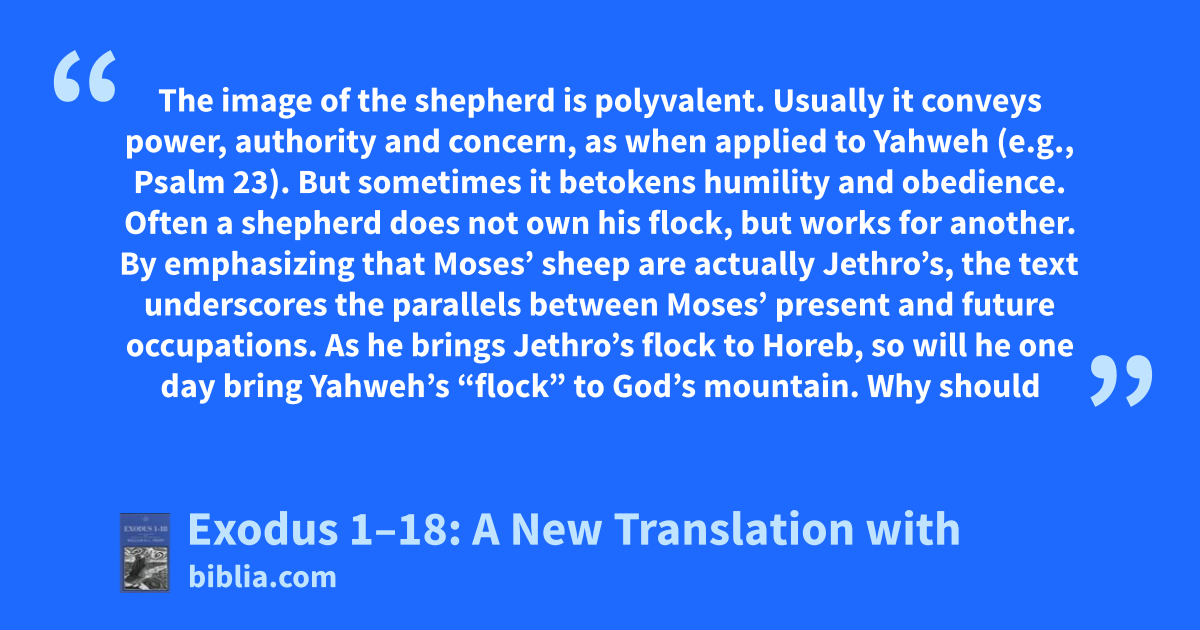 The image of the shepherd is polyvalent. Usually it conveys power, authority and concern, as when applied to Yahweh (e.g., Psalm 23). But sometimes it betokens humility and obedience. Often a shepherd does not own his flock, but works for another. By emphasizing that Moses’ sheep are actually Jethro’s, the text underscores the parallels between Moses’ present and future occupations. As he brings Jethro’s flock to Horeb, so will he one day bring Yahweh’s “flock” to God’s mountain. Why should