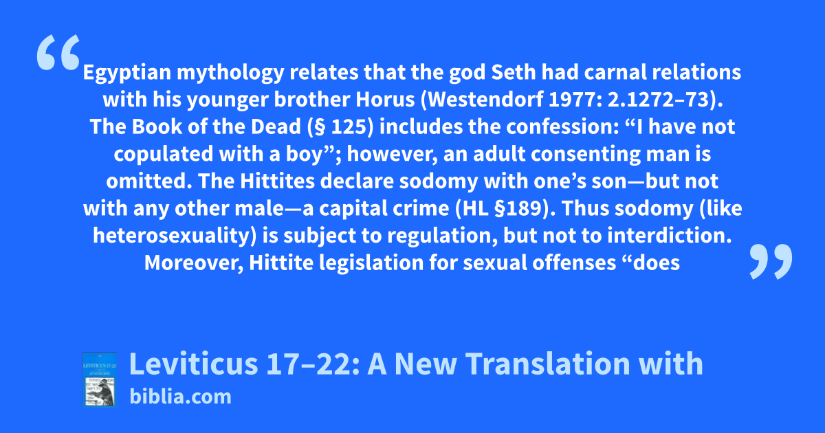 Egyptian mythology relates that the god Seth had carnal relations with his younger brother Horus (Westendorf 1977: 2.1272–73). The Book of the Dead (§ 125) includes the confession: “I have not copulated with a boy”; however, an adult consenting man is omitted. The Hittites declare sodomy with one’s son—but not with any other male—a capital crime (HL §189). Thus sodomy (like heterosexuality) is subject to regulation, but not to interdiction. Moreover, Hittite legislation for sexual offenses “does