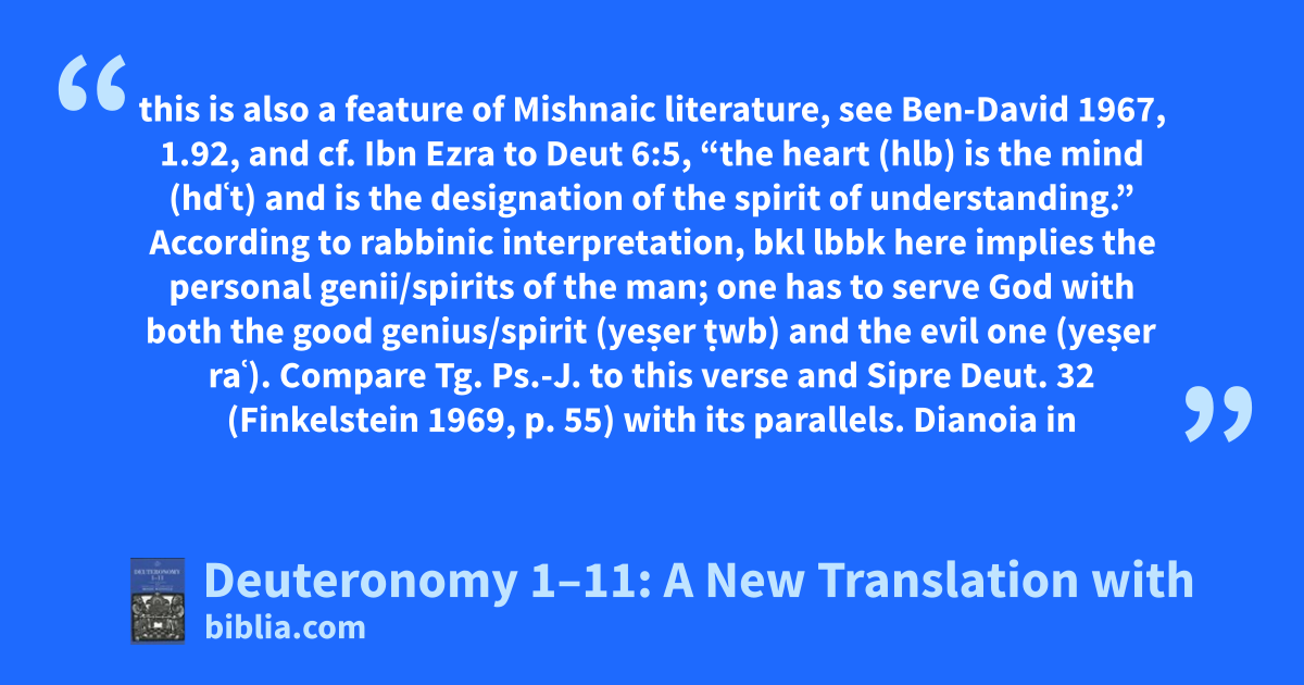this is also a feature of Mishnaic literature, see Ben-David 1967, 1.92, and cf. Ibn Ezra to Deut 6:5, “the heart (hlb) is the mind (hdʿt) and is the designation of the spirit of understanding.” According to rabbinic interpretation, bkl lbbk here implies the personal genii/spirits of the man; one has to serve God with both the good genius/spirit (yeṣer ṭwb) and the evil one (yeṣer raʿ). Compare Tg. Ps.-J. to this verse and Sipre Deut. 32 (Finkelstein 1969, p. 55) with its parallels. Dianoia in