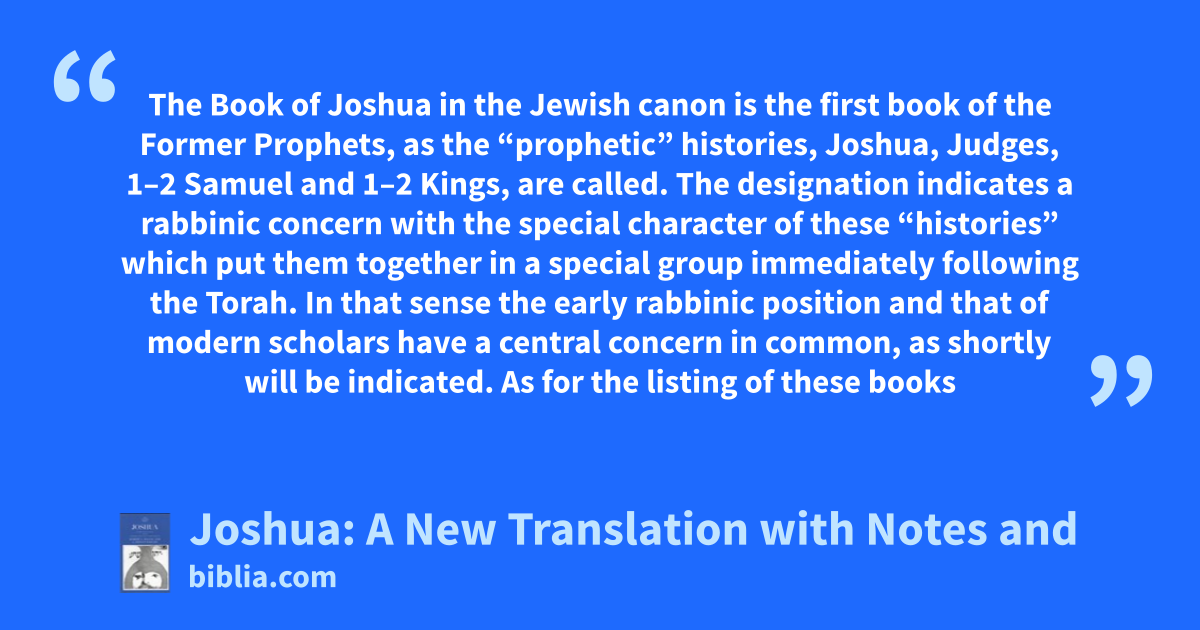 The Book of Joshua in the Jewish canon is the first book of the Former Prophets, as the “prophetic” histories, Joshua, Judges, 1–2 Samuel and 1–2 Kings, are called. The designation indicates a rabbinic concern with the special character of these “histories” which put them together in a special group immediately following the Torah. In that sense the early rabbinic position and that of modern scholars have a central concern in common, as shortly will be indicated. As for the listing of these books