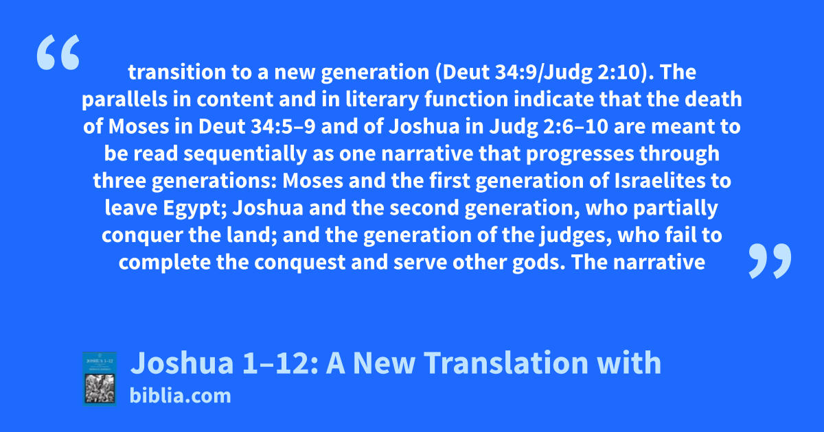 transition to a new generation (Deut 34:9/Judg 2:10). The parallels in content and in literary function indicate that the death of Moses in Deut 34:5–9 and of Joshua in Judg 2:6–10 are meant to be read sequentially as one narrative that progresses through three generations: Moses and the first generation of Israelites to leave Egypt; Joshua and the second generation, who partially conquer the land; and the generation of the judges, who fail to complete the conquest and serve other gods. The narrative