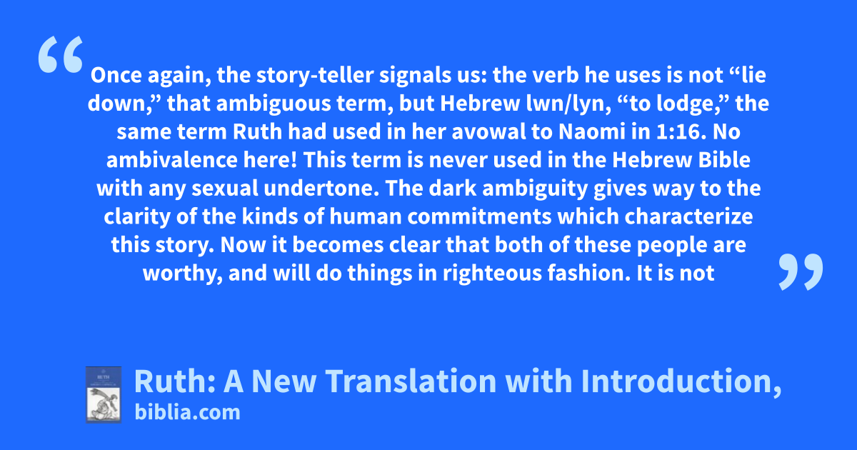 Once again, the story-teller signals us: the verb he uses is not “lie down,” that ambiguous term, but Hebrew lwn/lyn, “to lodge,” the same term Ruth had used in her avowal to Naomi in 1:16. No ambivalence here! This term is never used in the Hebrew Bible with any sexual undertone. The dark ambiguity gives way to the clarity of the kinds of human commitments which characterize this story. Now it becomes clear that both of these people are worthy, and will do things in righteous fashion. It is not