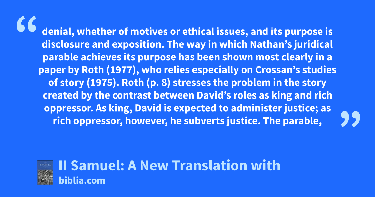 denial, whether of motives or ethical issues, and its purpose is disclosure and exposition. The way in which Nathan’s juridical parable achieves its purpose has been shown most clearly in a paper by Roth (1977), who relies especially on Crossan’s studies of story (1975). Roth (p. 8) stresses the problem in the story created by the contrast between David’s roles as king and rich oppressor. As king, David is expected to administer justice; as rich oppressor, however, he subverts justice. The parable,