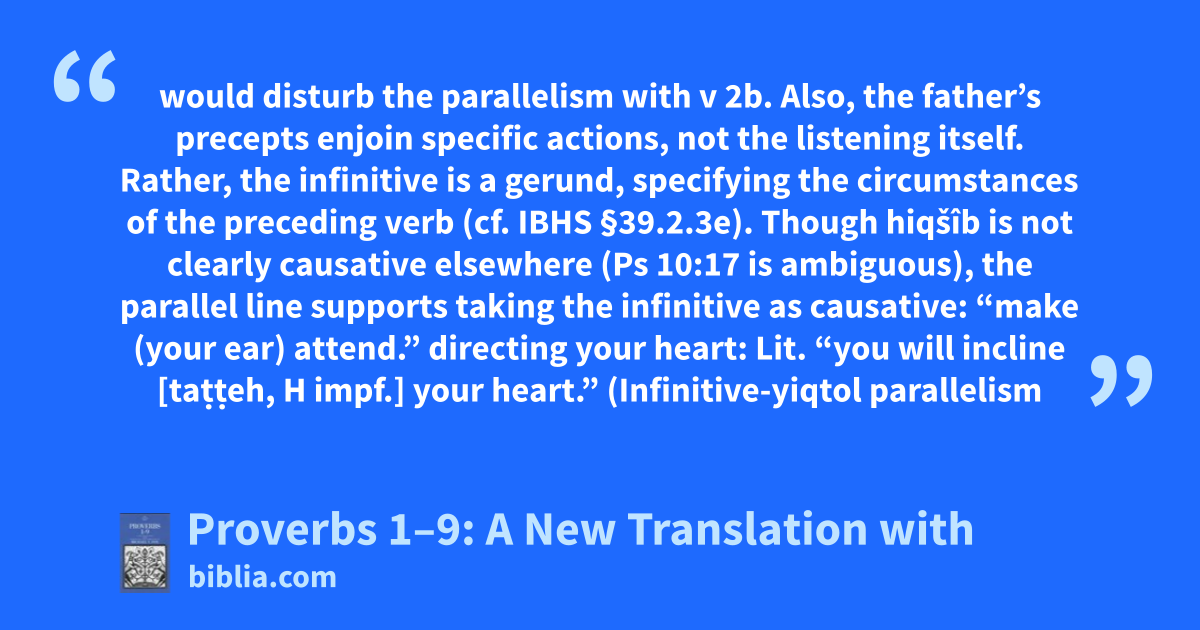 would disturb the parallelism with v 2b. Also, the father’s precepts enjoin specific actions, not the listening itself. Rather, the infinitive is a gerund, specifying the circumstances of the preceding verb (cf. IBHS §39.2.3e). Though hiqšîb is not clearly causative elsewhere (Ps 10:17 is ambiguous), the parallel line supports taking the infinitive as causative: “make (your ear) attend.” directing your heart: Lit. “you will incline [taṭṭeh, H impf.] your heart.” (Infinitive-yiqtol parallelism