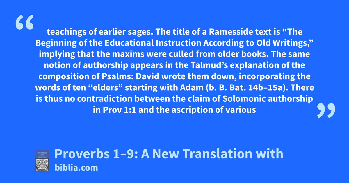 teachings of earlier sages. The title of a Ramesside text is “The Beginning of the Educational Instruction According to Old Writings,” implying that the maxims were culled from older books. The same notion of authorship appears in the Talmud’s explanation of the composition of Psalms: David wrote them down, incorporating the words of ten “elders” starting with Adam (b. B. Bat. 14b–15a). There is thus no contradiction between the claim of Solomonic authorship in Prov 1:1 and the ascription of various
