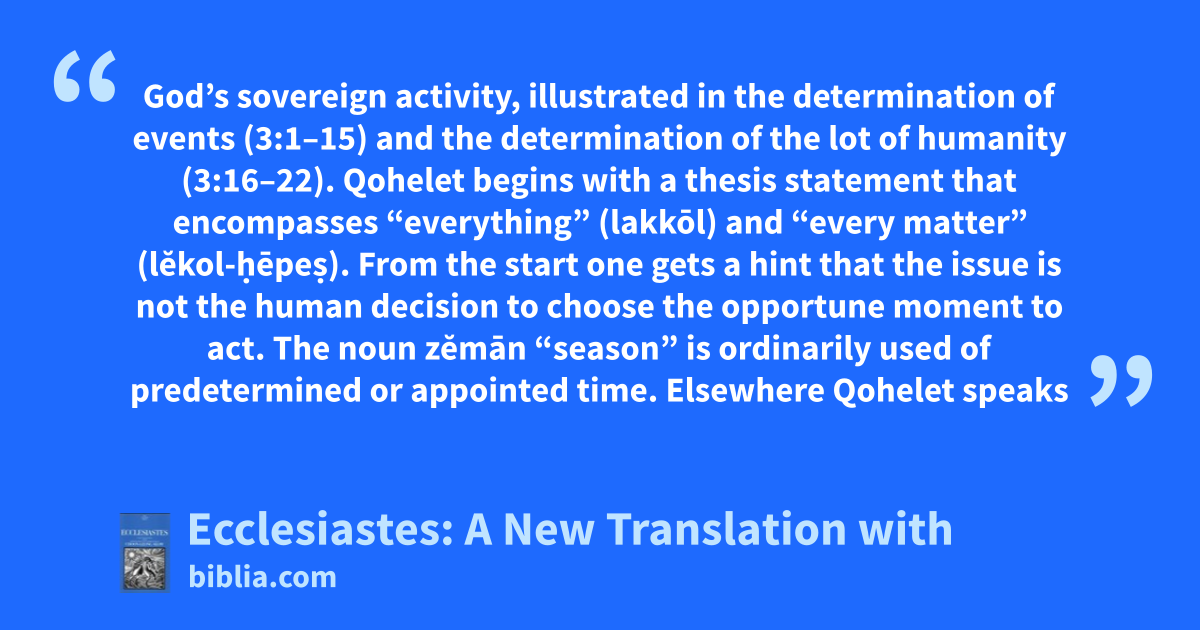God’s sovereign activity, illustrated in the determination of events (3:1–15) and the determination of the lot of humanity (3:16–22). Qohelet begins with a thesis statement that encompasses “everything” (lakkōl) and “every matter” (lĕkol-ḥēpeṣ). From the start one gets a hint that the issue is not the human decision to choose the opportune moment to act. The noun zĕmān “season” is ordinarily used of predetermined or appointed time. Elsewhere Qohelet speaks
