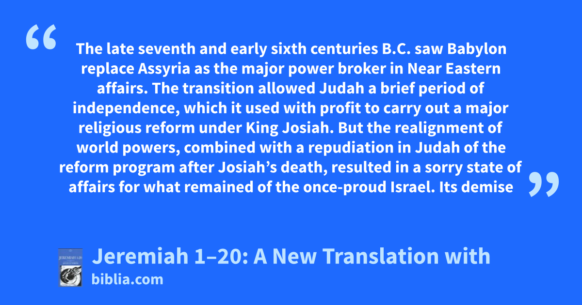 The late seventh and early sixth centuries B.C. saw Babylon replace Assyria as the major power broker in Near Eastern affairs. The transition allowed Judah a brief period of independence, which it used with profit to carry out a major religious reform under King Josiah. But the realignment of world powers, combined with a repudiation in Judah of the reform program after Josiah’s death, resulted in a sorry state of affairs for what remained of the once-proud Israel. Its demise