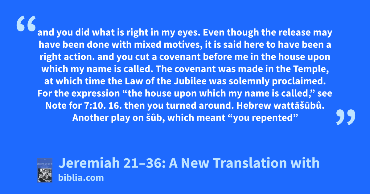 and you did what is right in my eyes. Even though the release may have been done with mixed motives, it is said here to have been a right action. and you cut a covenant before me in the house upon which my name is called. The covenant was made in the Temple, at which time the Law of the Jubilee was solemnly proclaimed. For the expression “the house upon which my name is called,” see Note for 7:10. 16. then you turned around. Hebrew wattāšūbû. Another play on šûb, which meant “you repented”