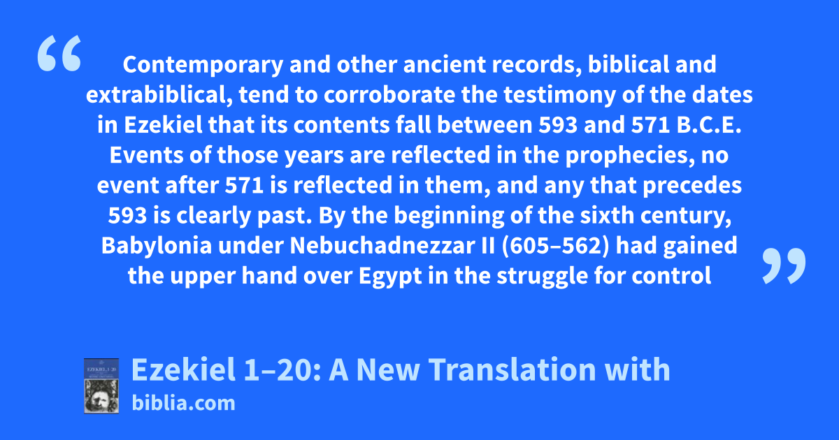 Contemporary and other ancient records, biblical and extrabiblical, tend to corroborate the testimony of the dates in Ezekiel that its contents fall between 593 and 571 B.C.E. Events of those years are reflected in the prophecies, no event after 571 is reflected in them, and any that precedes 593 is clearly past. By the beginning of the sixth century, Babylonia under Nebuchadnezzar II (605–562) had gained the upper hand over Egypt in the struggle for control