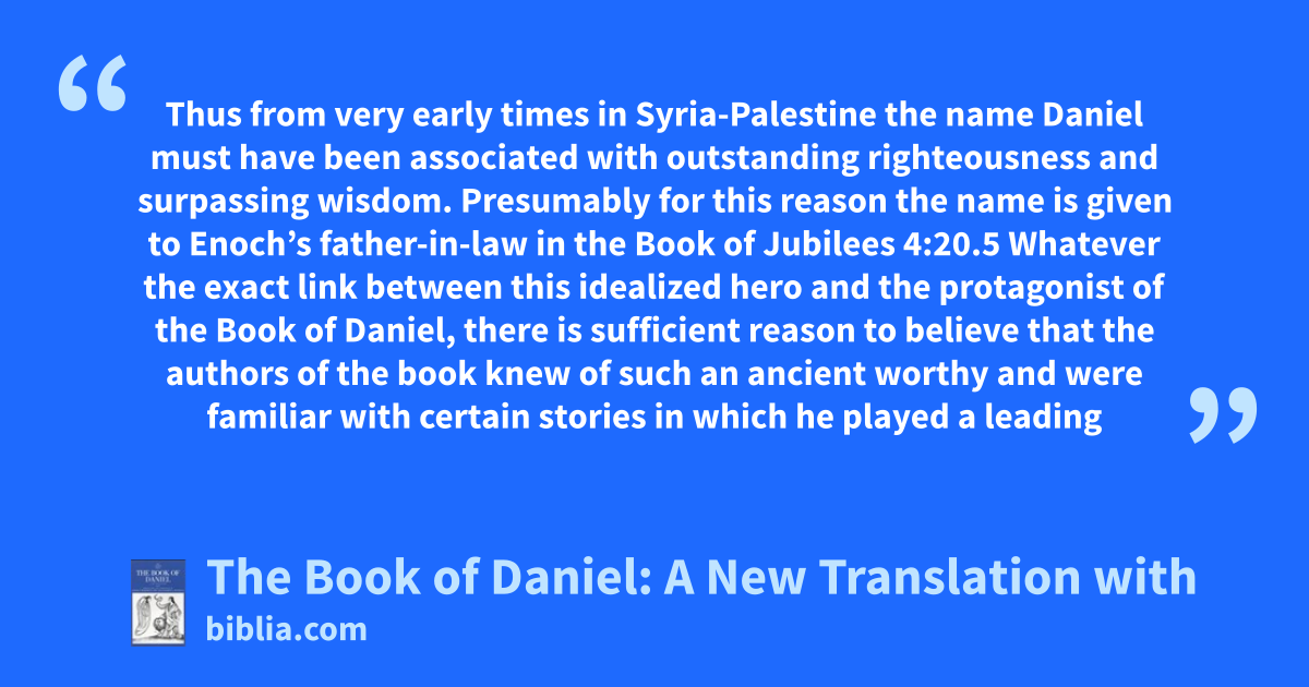 Thus from very early times in Syria-Palestine the name Daniel must have been associated with outstanding righteousness and surpassing wisdom. Presumably for this reason the name is given to Enoch’s father-in-law in the Book of Jubilees 4:20.5 Whatever the exact link between this idealized hero and the protagonist of the Book of Daniel, there is sufficient reason to believe that the authors of the book knew of such an ancient worthy and were familiar with certain stories in which he played a leading
