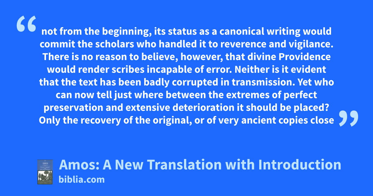 not from the beginning, its status as a canonical writing would commit the scholars who handled it to reverence and vigilance. There is no reason to believe, however, that divine Providence would render scribes incapable of error. Neither is it evident that the text has been badly corrupted in transmission. Yet who can now tell just where between the extremes of perfect preservation and extensive deterioration it should be placed? Only the recovery of the original, or of very ancient copies close