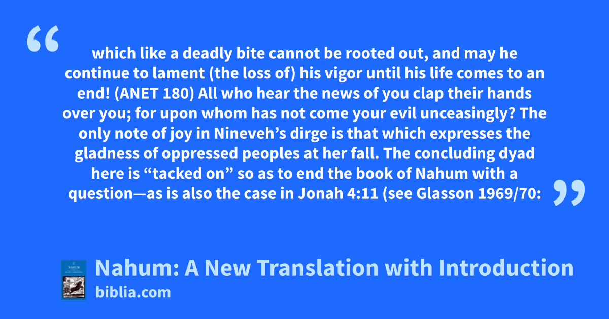 which like a deadly bite cannot be rooted out, and may he continue to lament (the loss of) his vigor until his life comes to an end! (ANET 180) All who hear the news of you clap their hands over you; for upon whom has not come your evil unceasingly? The only note of joy in Nineveh’s dirge is that which expresses the gladness of oppressed peoples at her fall. The concluding dyad here is “tacked on” so as to end the book of Nahum with a question—as is also the case in Jonah 4:11 (see Glasson 1969/70: