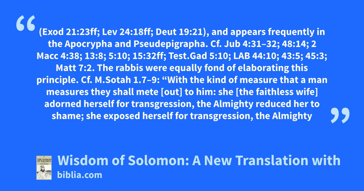 (Exod 21:23ff; Lev 24:18ff; Deut 19:21), and appears frequently in the Apocrypha and Pseudepigrapha. Cf. Jub 4:31–32; 48:14; 2 Macc 4:38; 13:8; 5:10; 15:32ff; Test.Gad 5:10; LAB 44:10; 43:5; 45:3; Matt 7:2. The rabbis were equally fond of elaborating this principle. Cf. M.Sotah 1.7–9: “With the kind of measure that a man measures they shall mete [out] to him: she [the faithless wife] adorned herself for transgression, the Almighty reduced her to shame; she exposed herself for transgression, the Almighty