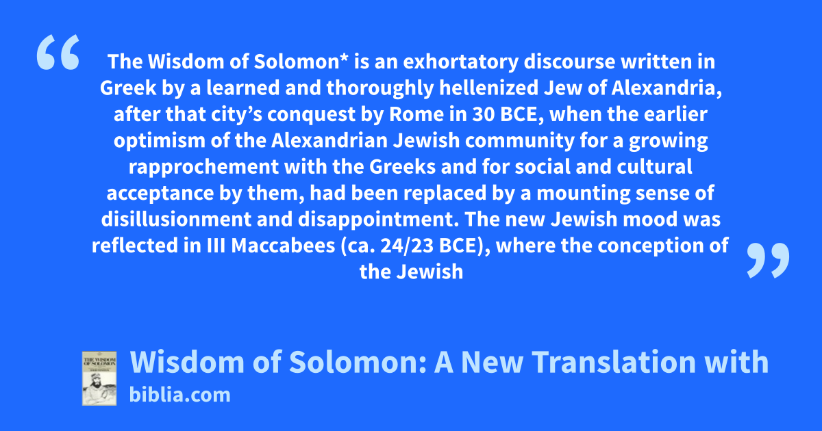 The Wisdom of Solomon* is an exhortatory discourse written in Greek by a learned and thoroughly hellenized Jew of Alexandria, after that city’s conquest by Rome in 30 BCE, when the earlier optimism of the Alexandrian Jewish community for a growing rapprochement with the Greeks and for social and cultural acceptance by them, had been replaced by a mounting sense of disillusionment and disappointment. The new Jewish mood was reflected in III Maccabees (ca. 24/23 BCE), where the conception of the Jewish