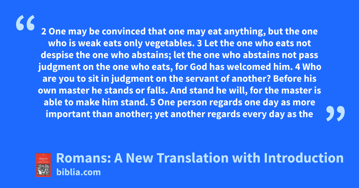2 One may be convinced that one may eat anything, but the one who is weak eats only vegetables. 3 Let the one who eats not despise the one who abstains; let the one who abstains not pass judgment on the one who eats, for God has welcomed him. 4 Who are you to sit in judgment on the servant of another? Before his own master he stands or falls. And stand he will, for the master is able to make him stand. 5 One person regards one day as more important than another; yet another regards every day as the