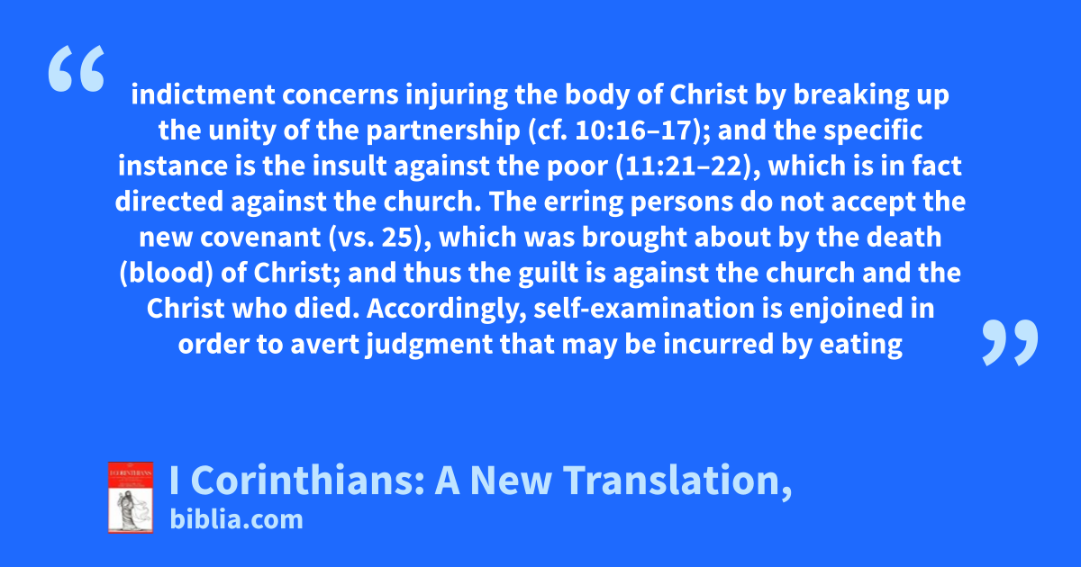 indictment concerns injuring the body of Christ by breaking up the unity of the partnership (cf. 10:16–17); and the specific instance is the insult against the poor (11:21–22), which is in fact directed against the church. The erring persons do not accept the new covenant (vs. 25), which was brought about by the death (blood) of Christ; and thus the guilt is against the church and the Christ who died. Accordingly, self-examination is enjoined in order to avert judgment that may be incurred by eating