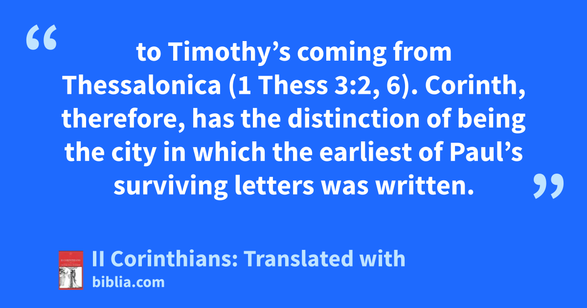 to Timothy’s coming from Thessalonica (1 Thess 3:2, 6). Corinth, therefore, has the distinction of being the city in which the earliest of Paul’s surviving letters was written.