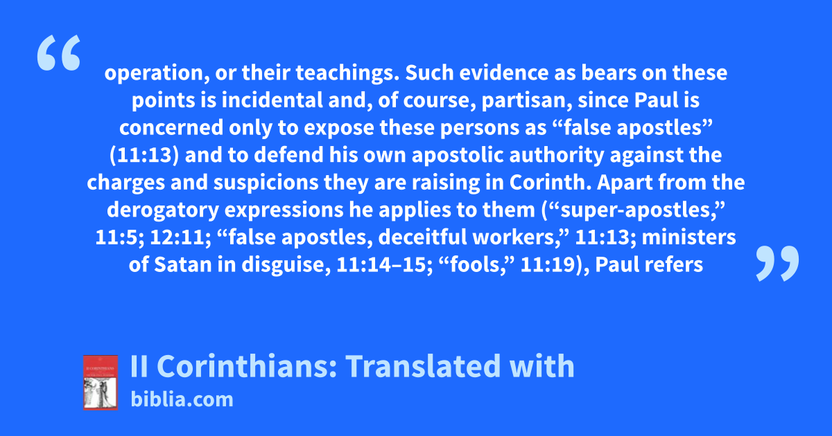 operation, or their teachings. Such evidence as bears on these points is incidental and, of course, partisan, since Paul is concerned only to expose these persons as “false apostles” (11:13) and to defend his own apostolic authority against the charges and suspicions they are raising in Corinth. Apart from the derogatory expressions he applies to them (“super-apostles,” 11:5; 12:11; “false apostles, deceitful workers,” 11:13; ministers of Satan in disguise, 11:14–15; “fools,” 11:19), Paul refers