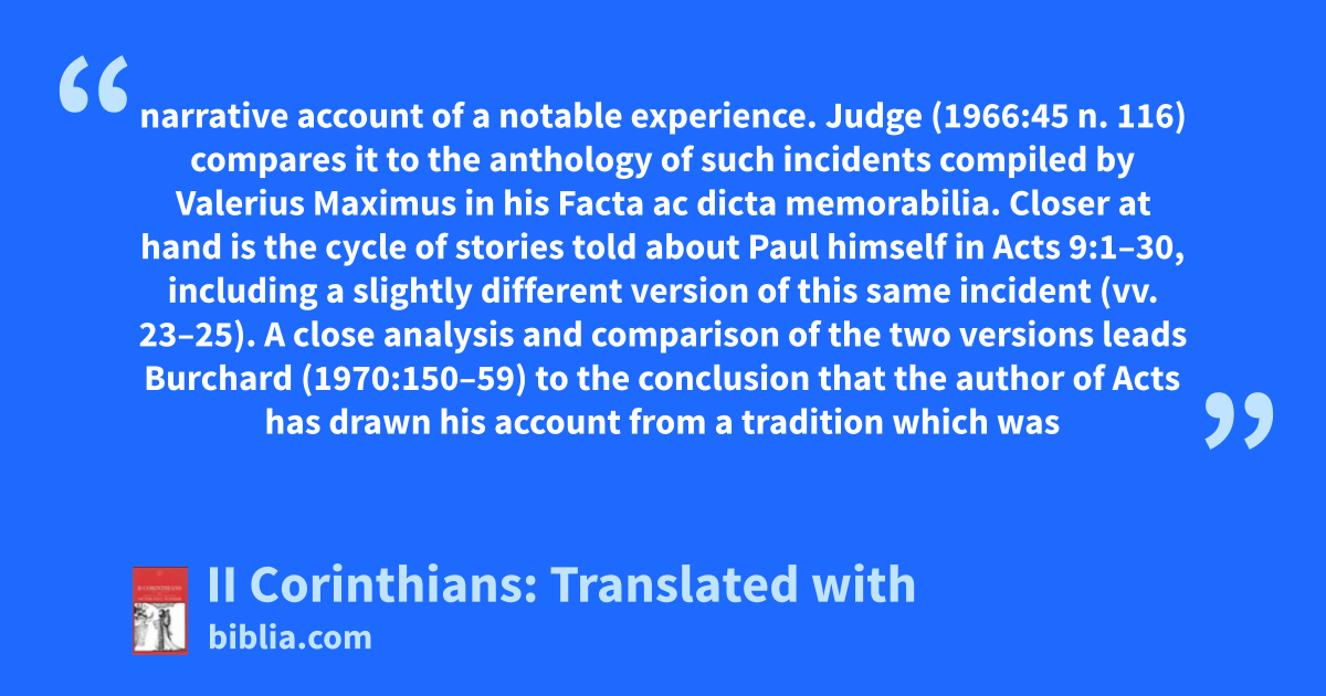 narrative account of a notable experience. Judge (1966:45 n. 116) compares it to the anthology of such incidents compiled by Valerius Maximus in his Facta ac dicta memorabilia. Closer at hand is the cycle of stories told about Paul himself in Acts 9:1–30, including a slightly different version of this same incident (vv. 23–25). A close analysis and comparison of the two versions leads Burchard (1970:150–59) to the conclusion that the author of Acts has drawn his account from a tradition which was