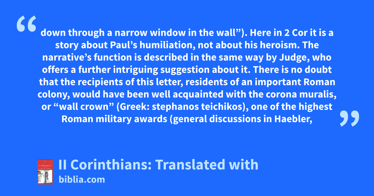 down through a narrow window in the wall”). Here in 2 Cor it is a story about Paul’s humiliation, not about his heroism. The narrative’s function is described in the same way by Judge, who offers a further intriguing suggestion about it. There is no doubt that the recipients of this letter, residents of an important Roman colony, would have been well acquainted with the corona muralis, or “wall crown” (Greek: stephanos teichikos), one of the highest Roman military awards (general discussions in Haebler,