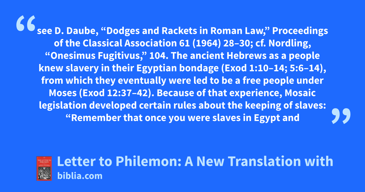 see D. Daube, “Dodges and Rackets in Roman Law,” Proceedings of the Classical Association 61 (1964) 28–30; cf. Nordling, “Onesimus Fugitivus,” 104. The ancient Hebrews as a people knew slavery in their Egyptian bondage (Exod 1:10–14; 5:6–14), from which they eventually were led to be a free people under Moses (Exod 12:37–42). Because of that experience, Mosaic legislation developed certain rules about the keeping of slaves: “Remember that once you were slaves in Egypt and