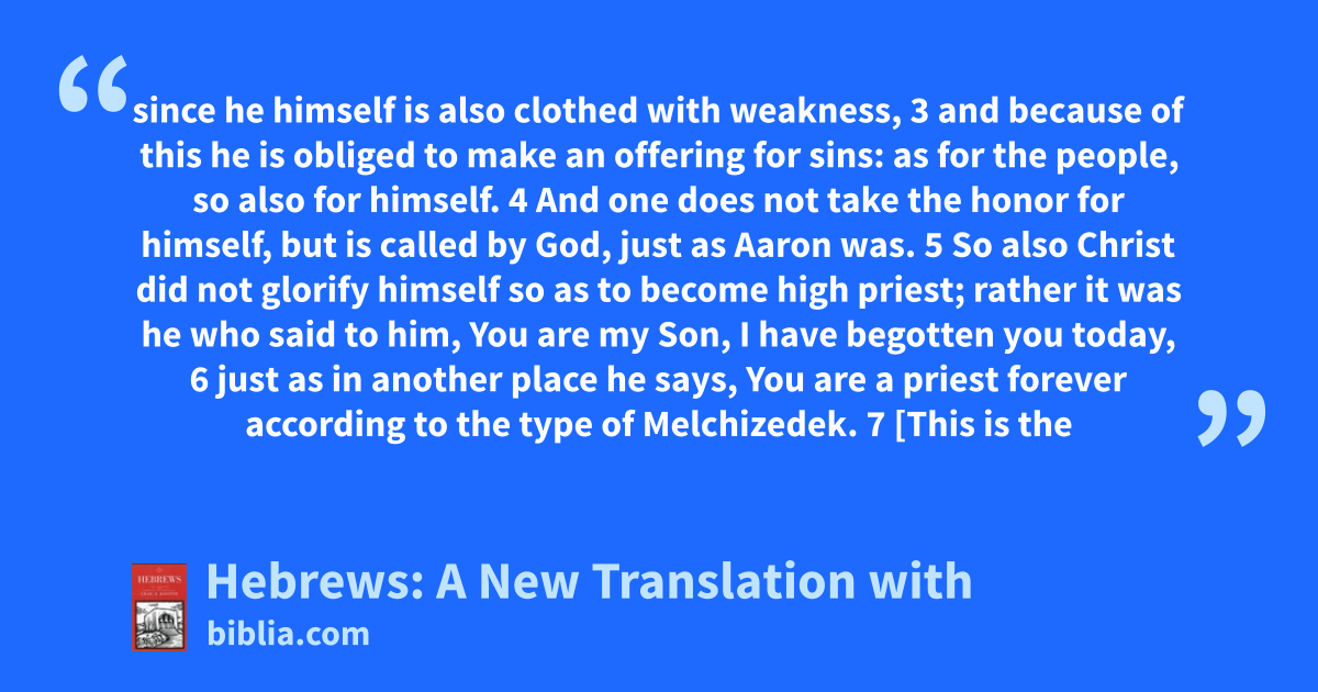since he himself is also clothed with weakness, 3 and because of this he is obliged to make an offering for sins: as for the people, so also for himself. 4 And one does not take the honor for himself, but is called by God, just as Aaron was. 5 So also Christ did not glorify himself so as to become high priest; rather it was he who said to him, You are my Son, I have begotten you today, 6 just as in another place he says, You are a priest forever according to the type of Melchizedek. 7 [This is the